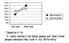 Furthermore, students self-reported "feelings of concern when others were disparaged because they looked or behaved differently" showed an even greater increase. Changes in self report of feeling bothered when people put down others because of differences* |