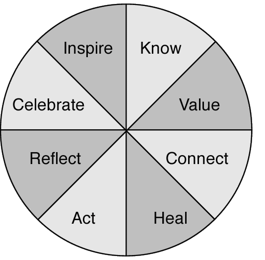 No matter how one defines "community"family, neighborhood, classroom, school, workplace, town, nation, or other associationone must recognize the role of community in the learning process. To facilitate a "Human Rights Learning Community," everyone must recognize that each participant has his/her own identity as well as a collective identity of learning together about human rights and responsibilities. How can we build community? More specifically, how can we create a community which focuses on education "directed to the full development of the human personality and to the strengthening of respect for human rights and fundamental freedoms" (excerpted from Article 26 of the Universal Declaration of Human Rights)? The Need for CommunityA Common Vision and LanguageWhether one focuses on a school, town, or other association, each has similar needs of creating a place where every member can learn, feel valued and safe, and connect with others. Schools have been challenged by multiple initiatives placed one upon another (e.g., safe schools, peace schools, literacy projects, educational standards). Towns have witnessed the same separation of issue-based initiatives (e.g., fair housing projects, domestic violence centers, food shelves, immigration and refugee services). However, in both community settings, the unifying overlap is a human rights framework. Whether a community is working on assuring peace and security, housing, education, or food, that community must understand the interdependence and universality of all their needs as human rights. Reclaiming our human rights enables us to share a common vision, speak the same language, and practice responsible actions toward one another. The Practice for Human Rights Learning CommunitiesHuman Rights Learning Communities aim to promote and enhance effective leadership and responsible action for the realization of human rights. Human Rights Learning Communities should also support and strengthen the personal and professional development of the facilitators and the participants. The Human Rights Learning Community Wheel provides eight characteristics of ways each member of society should act in community to encourage inspiration, exploration, creation, collaboration, and transformation. The Human Rights Learning Community WheelA Human Rights Learning Community includes both individual and collective learning and practices. The following eight characteristics in the Human Rights Learning Community Wheel are interdependent components for nurturing one's creative individual and community spirit. These components aid facilitators and participants to challenge themselves and the other community members to identify what inspires their action and inaction. However, these eight components are not exhaustive: your own community may choose to add others. The characteristics are not presented in any specific order, since all aspects are of equal importance.
